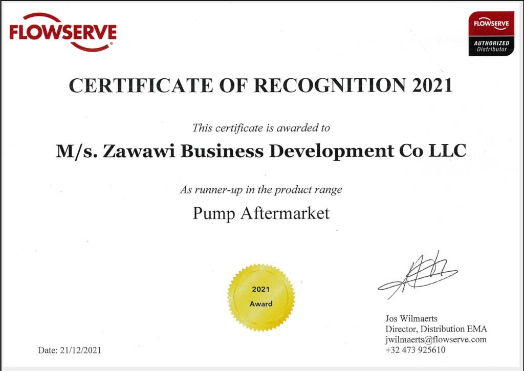 Runner up Award for best performing distributor for After market sales for the year by Flowserve – Pumps Division